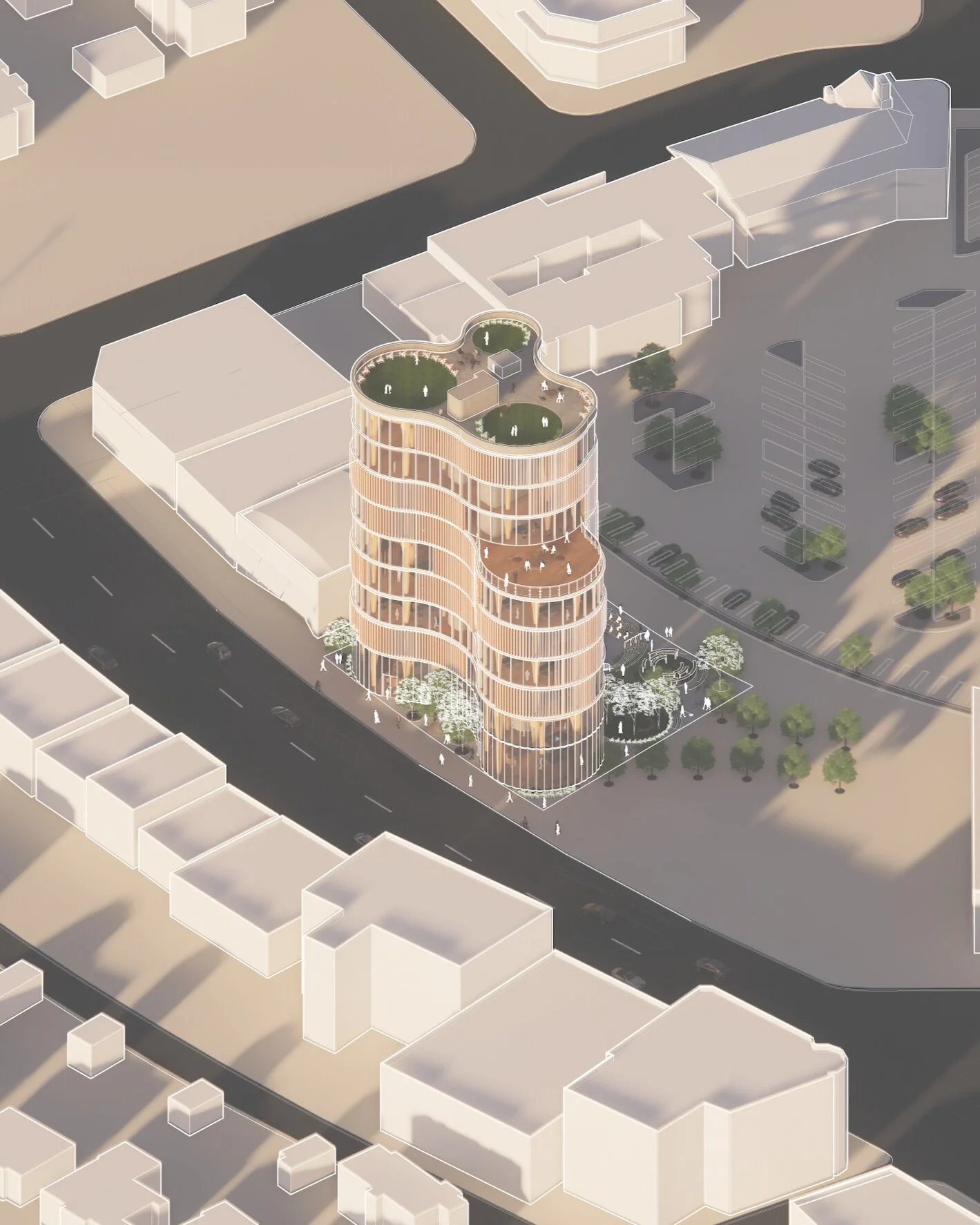 Leimart Park, one of the most historic neighborhoods of Los Angeles, is a highly densified residential community that overflows with art and culture. However, a lack of accessible public and performance space permeates in this culturally rich zone. The USC Center for Social Justice mitigates this problem by creating a public plaza that brings together the community with a central amphitheater and multi-use park. As a symbol of unison and inclusion, the circle is the foundation for the design elements of the project. As the result of the programmed circles, the responding organic shape of the building emphasizes sustainable qualities including natural light, shading, and ventilation within a lively work environment.